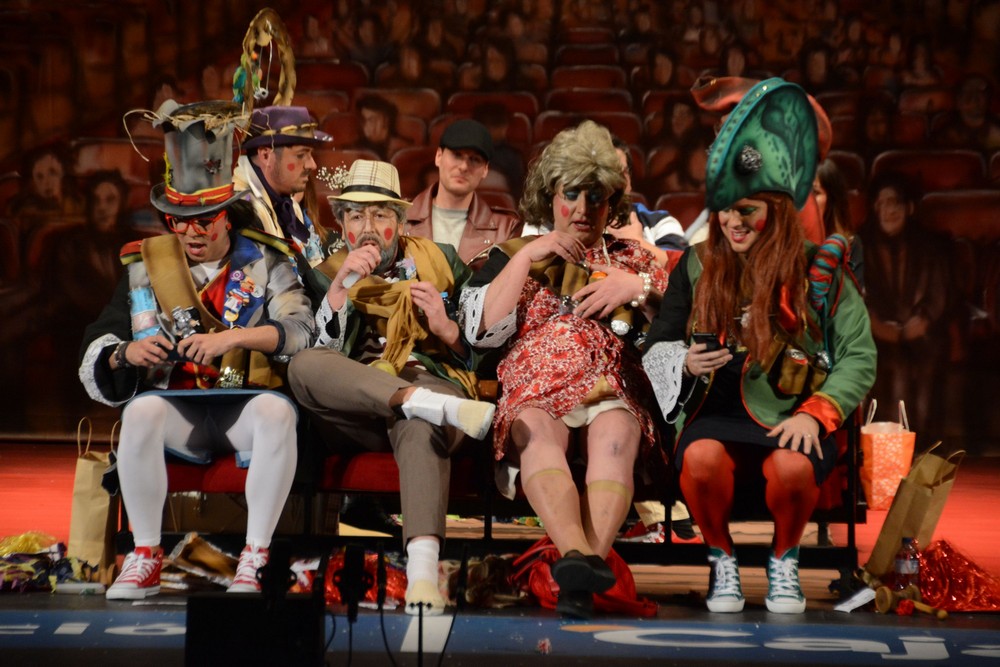 Por último, la chirigota del barrio Santa María salvan una sesión con poquitas sorpresas. «Yo soy tú» dicen. Claro, van de aficionados sentados en el Teatro. Reparten risas porque además el tipo tiene multitud de posibilidades. Buenos pasodobles con una música exquisita de ésas que a Cai tanto les gusta y encima la cantan requetebien. Letra homenaje a «Los Cruzados Mágicos» de los Rosado. Buen detalle. Merecido sin duda. Intentan recrear el jaleo del teatro. Lo consiguen. Buen repertorio en general. Dejan buen rollo.