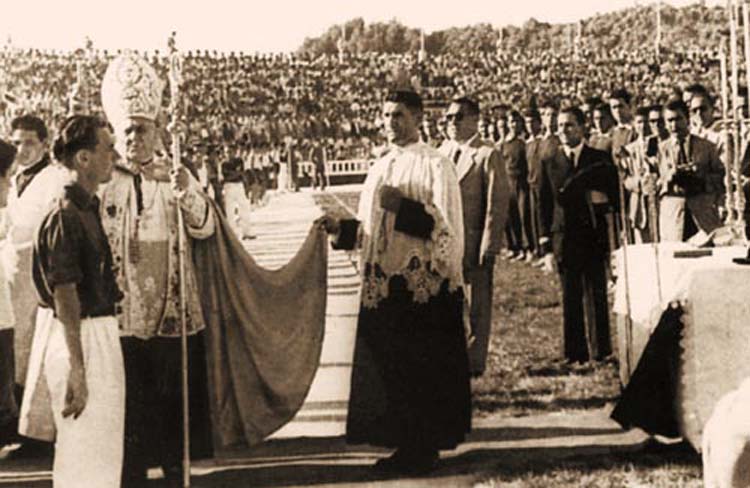 En torno a las 17.30, el obispo Tomás Gutiérrez Díez con la ayuda del párroco de San José, D. Camilo García de Valenzuela proceden a la por entonces habitual bendición. Un rito muy popular en los años del franquismo. Allí asisten además de las lógicas autoridades locales y provinciales, personajes de la talla de Sáenz de Buruaga, el general Ruiz Sáenz de Santamaría o el presidente del Sevilla, Ramón Sánchez Pizjuán.