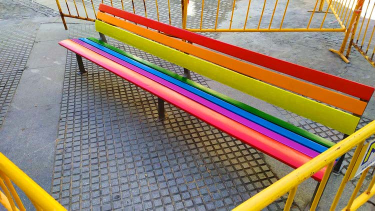 La plaza del PALILLERO ya luce bancos con los colores de la bandera LGTBI