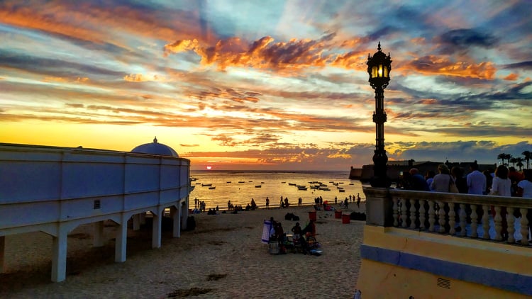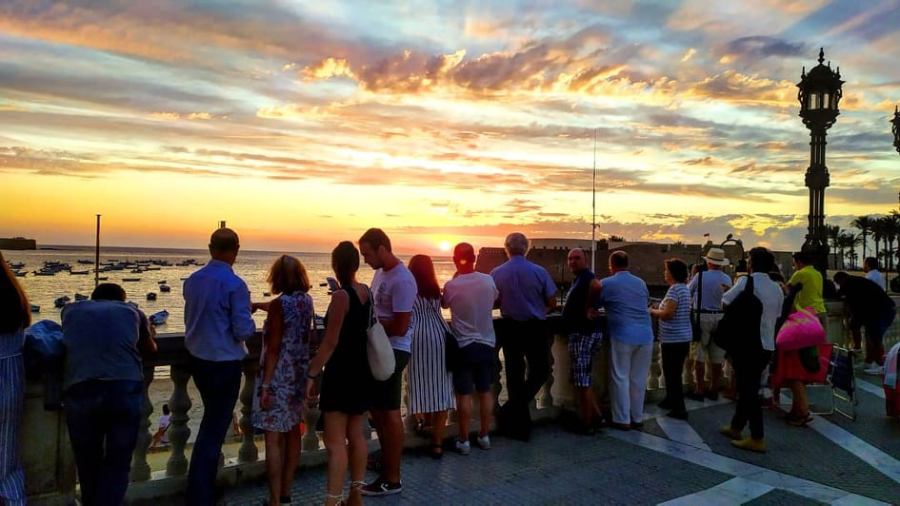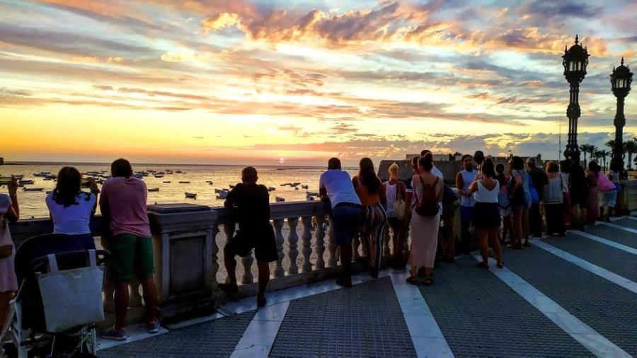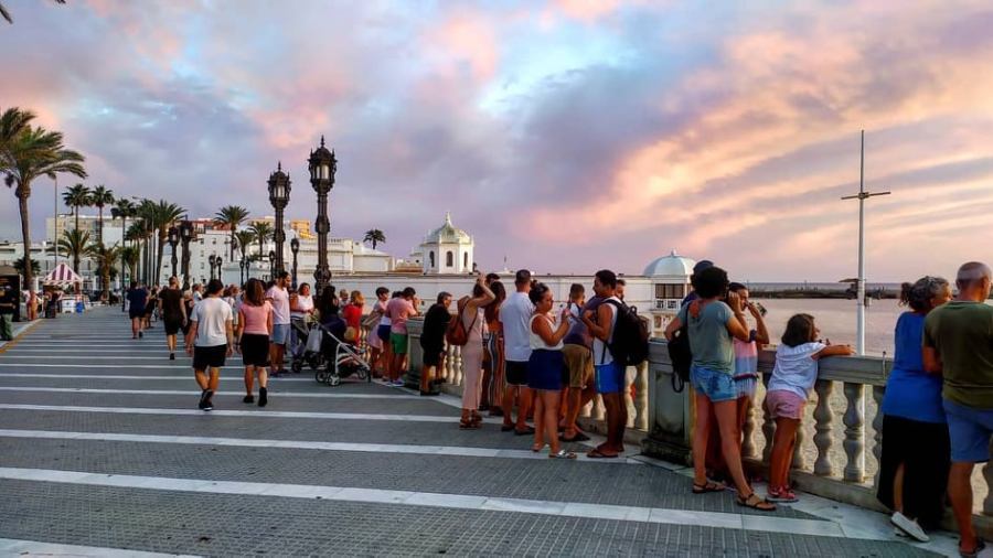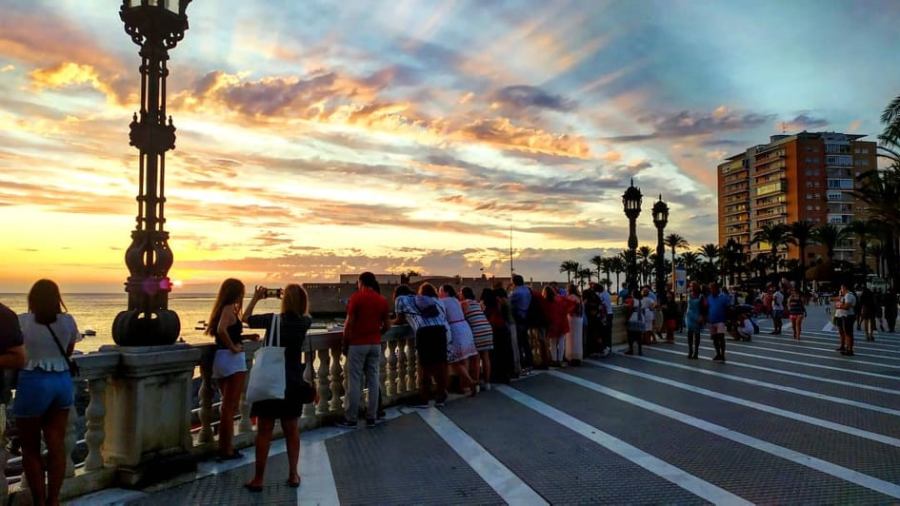 Frente a todo eso, el sol comienza a colorear de naranja el Balneario de la Palma y un buen número de personas con su móvil en la mano inmortalizan el mágico momento. La imagen me llama poderosamente la atención. Numerosas familias, amigos, estoy seguro que algún que otro gaditano/a, y muchos visitantes contemplan como el sol muere un día más en la Caleta. En sus rostros, la ilusión y la sorpresa les ilumina más que el propio sol. Cuando ya en sus ciudades de origen miren las fotografías, probablemente una sensación de nostalgia les recorra el cuerpo añorando ese momento y recordándolo como uno de los más especiales de las vacaciones en nuestra pequeña gran ciudad.