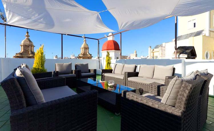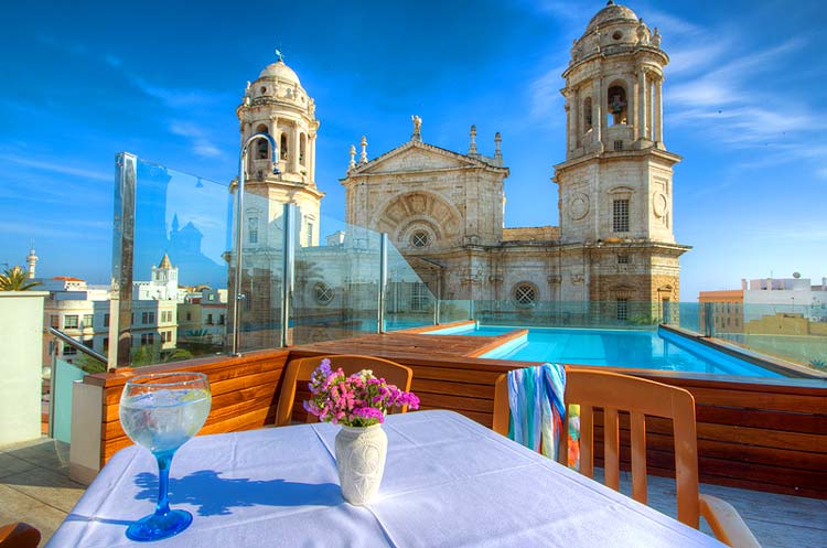 El hotel Las Cortes de Cádiz también se encuentra en pleno centro. Concretamente en la calle San Francisco. Abierto de 9.00 a 23.00 horas todos los días del año, en su azotea se puede tomar desde un cafe a un gintonic. Las vistas de la Catedral, la Bella Escondida o de los torreones y campanarios del casco histórico son espectaculares.