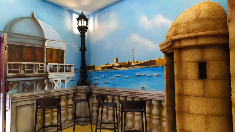 Imagine entrar en un lugar para comer o tomar algo y encontrarte con el balneario de la Caleta en su interior, andar solo unos pasos y poder almorzar sobre los arcos de las Puertas de Tierra o mirar al frente y encontrarte la fachada del Gran Teatro Falla. Pues desde este mismo viernes será posible gracias a la cuidada y sorprendente decoración que ha realizado Álvaro Ortega de «ArteVida, Factory», una empresa dedicada al diseño y creación de espacios, ya sean restaurantes, parques Infantiles, teatro, carnaval o musicales…. para PA´QUI O PA´LLEVÁ, el nuevo negocio hostelero que abrirá en el número 6 de la calle San Francisco. Un take away, que dará la opción a poder comer en el propio local o comprar la comida para llevar. De ahí el nombre.