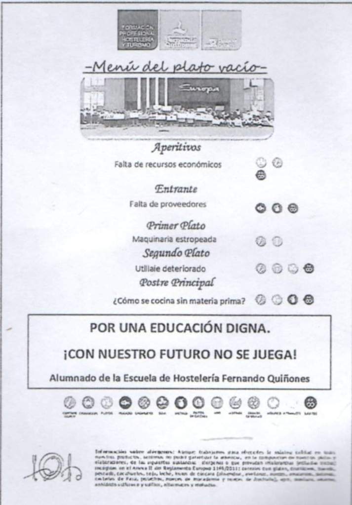 Aunque Diputación ayer intentaba tranquilizar a los alumnos con la pronta solución del problema, que no es otro si no adjudicar los contratos para el suministro de provisiones de cara a este curso, los alumnos se manifestaban hoy también repartiendo un reivindicativo menú.