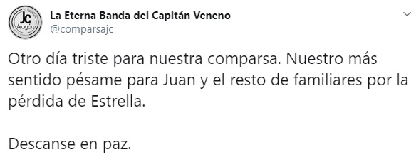 El año 2019 será imposible de olvidar para la familia Aragón Becerra. Si el pasado 17 de mayo recibía el duro golpe de perder con tan solo 51 años al genial autor de comparsas y chirigotas Juan Carlos Aragón, hoy los familiares y amigos han vuelto a recibir un duro varapalo tras el fallecimiento de Estrella, la madre de Juan Carlos. Así lo ha comunicado la comparsa de Juan Carlos a través de las redes sociales.