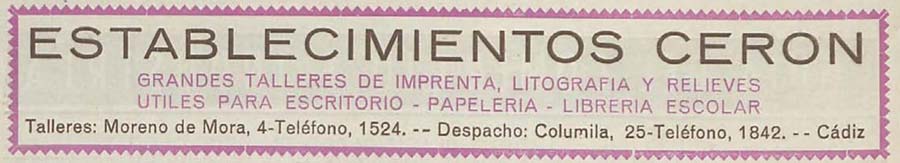 Por último, nos colocamos frente al Massimo Dutti de la calle Columela. Allí mismo el Establecimiento Cerón nos ofrecería útiles de escritorio, papelería y librería escolar. Se trataba de un taller de imprenta, litografía y relieves que consiguió hacerse muy popular en la ciudad y que realizó numerosas publicaciones.