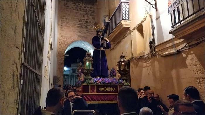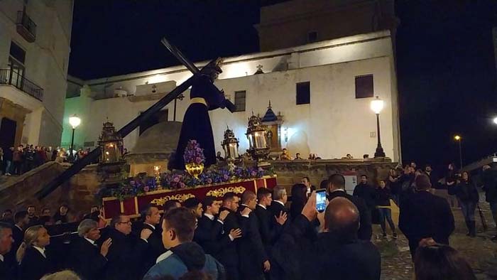 A la segunda sí pudo ser. Nuestro Padre Jesús del Mayor Dolor presidió por fin el Vía Crucis Oficial de Cádiz tras tener que suspenderlo en el 2013 a causa de las lluvias. Hoy, a las 19.30 salía de la Iglesia de Santa Cruz con dirección a la Catedral donde ha hecho estación de penitencia hasta las 21.15. Sobre las 21.45 llegaba al Pópulo atravesando el arco de la Rosa y dejando momentos tan sobrios como éstos.
