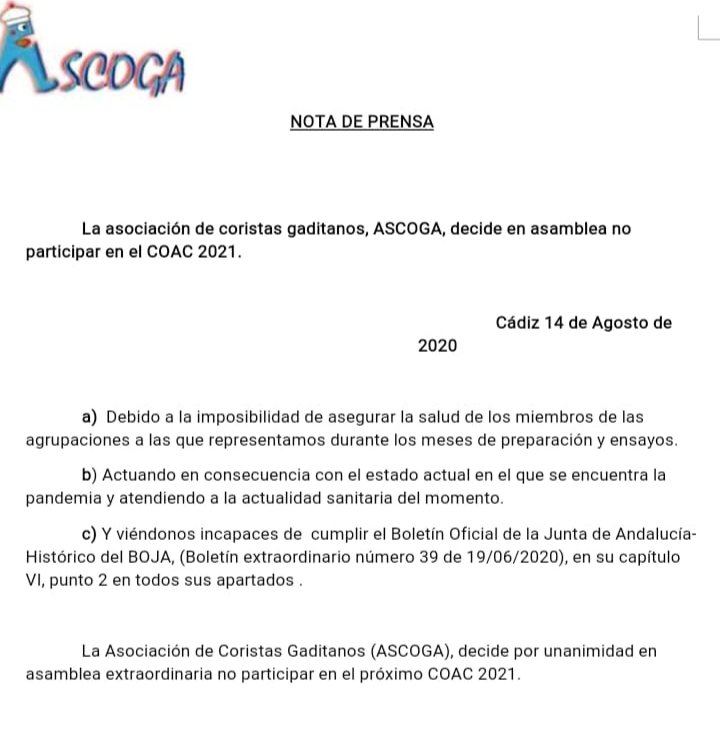 Es por eso que la asociación de coristas gaditanos, ASCOGA, ha decidido en una asamblea extraordinaria no participar en el Concurso de Agrupaciones Carnavalescas 2021. De esta manera y aunque se llevase a cabo, estaríamos ante una situación insólita: el COAC no tendría ningún coro entre sus participantes. Al menos gaditanos. Los coristas han tomado esta decisión ante «la imposibilidad de asegurar la salud de los miembros de las agrupaciones a las que representamos durante los meses de preparación y ensayos“ y la incapacidad d cumplir con ningún apartado del punto 2 del capítulo VI del Boletín Oficial de la Junta de Andalucía- Histórico del BOJA.
