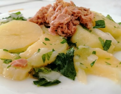Miguel fue muy amable y nos contó como hacen en LA CORCHUELA las papas aliñás. El secreto está en la papa. A veces tiene dificultad para encontrar la más idónea. Tras cocerla y dejar enfriar, se corta a rodajas y se le agrega vinagre de Chiclana o Jerez, aceite de oliva virgen extra, cebolleta y perejil muy picadito y finalmente sal. En La Corchuela la suelen servir con atún también por lo que solo se le tendría que añadir a todo lo anterior. Se remueve y a comer!!