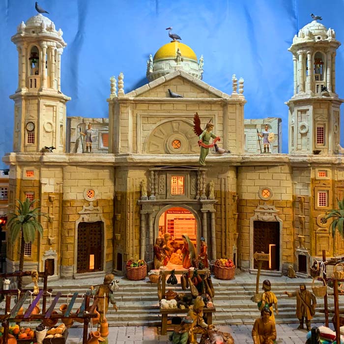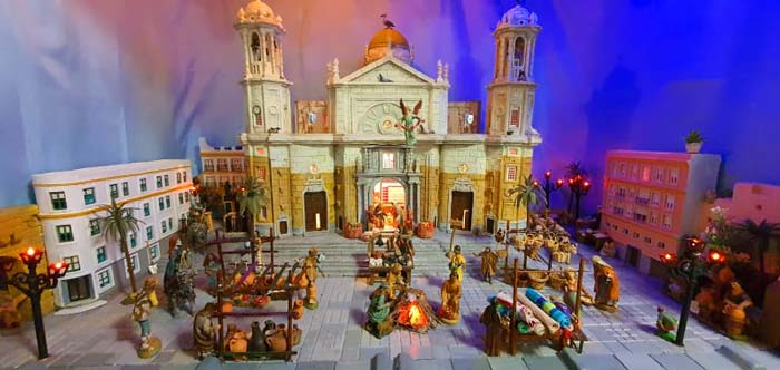 Imaginen que el origen de la nochebuena, la noche en la que dicen que Jesucristo nació, tiene lugar en la plaza de la Catedral de Cádiz, que los Reyes Magos de Oriente se encaminan desde Santa Cruz hasta la puerta de la Catedral para colmarlo de regalos y que la plaza se convierte en un magnífico mercadillo. Pues eso ahora es posible gracias al belén particular que ha realizado Fernando Devesa Castañeira. Este gaditano y padre de servidor ha utilizado un marco tan gaditano como la Catedral de Cádiz y su plaza como escenario del más tradicional Belén. Una maravilla, se lo digo yo!