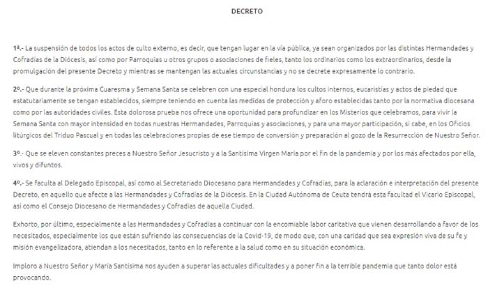 Mala noticia para los cofrades gaditanos. El Obispado ha confirmado hoy la suspensión de los desfiles procesionales que conforman la Semana Santa de Cádiz. La capital gaditana se quedará sin ella por segundo consecutivo como medida para evitar más contagios de Covid-19. Ha sido Rafael Zornoza quien ha tenido que tomar la dura decisión. Tras la confirmación de la suspensión de la Semana Santa de Sevilla la pasada semana, era un secreto a voces que la nuestra correría la misma suerte.