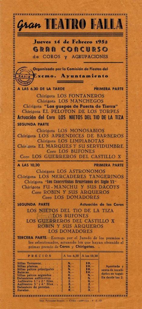 El año 1952 trajo el fin de las famosas cartillas de racionamiento que la guerra civil había provocado. Por fin las familias podían adquirir lo que desearan más que lo que le impusieran. Mientras Argentina lloraba la muerte de Evita Perón y el Corpus se descubría como una de las fiestas grandes de nuestra ciudad, el Carnaval seguía reuniendo a un gran número de aficionados.