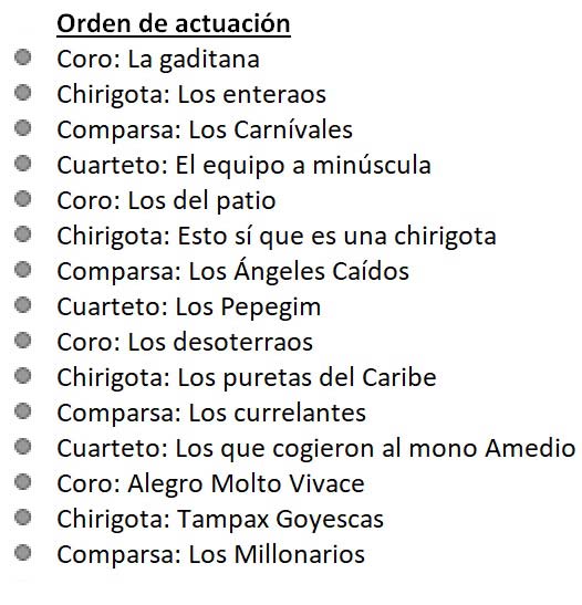 Una final que recreará la del concurso normal a través de los archivos de Canal Sur TV que contarán con los rostros habituales y en directo de Manolo Casal o Modesto Barragán. La sorpresa ha venido cuando anoche hacían público las agrupaciones finalistas y nos fijábamos que en comparsas hay dos de Juan Carlos Aragón: Los Millonarios y Los Angeles Caídos. De manera que el genio carnavalesco no solo «resucitará» por una noche sino que lo hará por partida doble. No es el único, el Morera también hará lo mismo en la modalidad de cuartetos. Éstas son las agrupaciones finalistas y su orden de actuación: