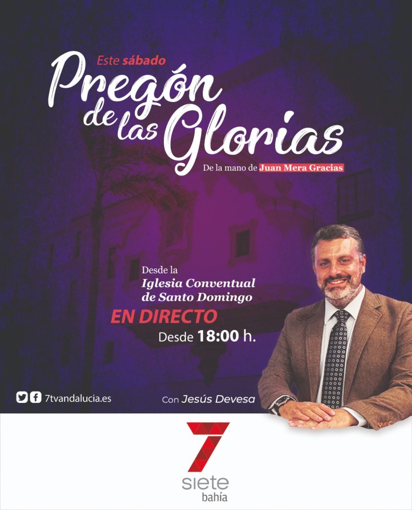 El próximo sábado 1 de mayo a las 18.00 horas en la iglesia de Santo Domingo tendrá lugar el tradicional Pregón de las Glorias, este año a cargo del gaditano Juan Mera que tras el Pregón de la Semana Santa de Cádiz en 2017 y el de la Patrona de la ciudad este año, se hará cargo de éste.