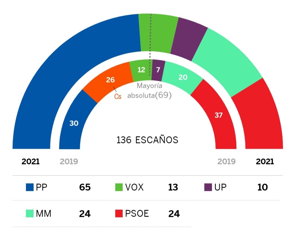 Por otra parte en la izquierda el gran perjudicado ha sido el socialista Ángel Gabilondo que de 37 escaños pasa a 24 empatando con Mónica García de Más Madrid que consigue su mejor resultado. Pablo Iglesias aunque ha logrado subir los resultados de Unidas Podemos con respecto al año pasado, no ha sido suficiente para sumar con el resto de izquierdas. El hasta hace poco vicepresidente del Gobierno ha anunciado que dejará la política y todos sus cargos. Sin embargo el gran perdedor de la noche ha sido Edmundo Bal que ha visto como tras perder 26 escaños, su partido Ciudadanos se ha quedado sin representación.