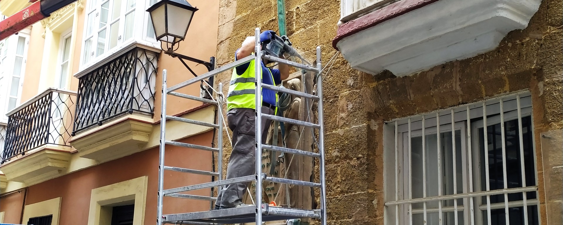Un grupo de fotógrafos observa atentamente a los operarios que llevan a cabo la polémica decisión por parte del Ayuntamiento de Cádiz de retirar la placa que José María Pemán tiene en la calle Isabel la Católica. Lo hacen cumpliendo la Ley de Memoria Histórica que obliga a retirar símbolos franquistas. En el caso de Pemán y según el concejal de Memoria Democrática Martín Vila responde a que «este reconocimiento a Pemán estuvo motivado y justificado por su participación activa en el Golpe de 1936. Conviene recordar que Pemán además participó en la Comisión de Depuración de Maestros, se implicó como ideólogo con los golpistas… es decir que formó parte del aparato represor de miles de vecinos y vecinas» ha dicho ha través de las redes sociales.