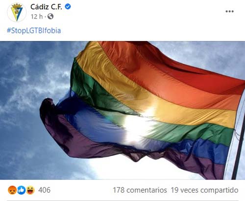 En el día de ayer el Cádiz CF ponía en su red social un post donde reivindicaba el fin de la homofobia. Pues bien, las reacciones tampoco se hacían esperar: a 140 personas por lo visto les enfadaba que un equipo de fútbol pidiese que un delito de odio acabe de una puñetera vez y a otros tantos directamente les divertía. Los comentarios daban auténtica vergüenza: «Hablar de fútbol que es lo que tenéis que hacer» decía uno. Otros apostaban por emojis donde quedaba patente el asco que les producía el post.