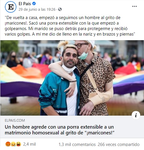Sea como fuere, el triste suceso ha vuelto a poner en evidencia la existencia de una homofobia que muchos se empeñan en ignorar tal y como hacen con la violencia de género. El otro día leía en EL PAÍS el siguiente titular: «Un hombre agrede con una porra extensible a un matrimonio homosexual al grito de “¡maricones!”. El post colgado en el Facebook del periódico recibía muchas interacciones y cuál era mi sorpresa (o no) que a más de 300 personas el hecho les producía diversión. Algunos comentarios eran incluso denunciables y denotaban un odio que hacía tiempo no se veía en un colectivo que parecía haber alcanzado la ansiada normalidad. Las alusiones a los chiringuitos que para ellos suponen el colectivo LGTBI era de lo más repetido…