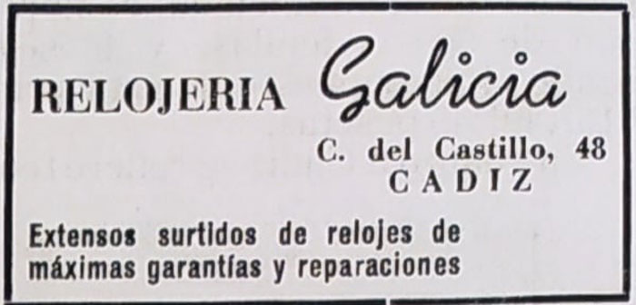 Finalmente y prácticamente frente a lo que hoy es la Casa de la Juventud, nos encontraríamos con la relojería Galicia con extensos surtidos de relojes y reparaciones.