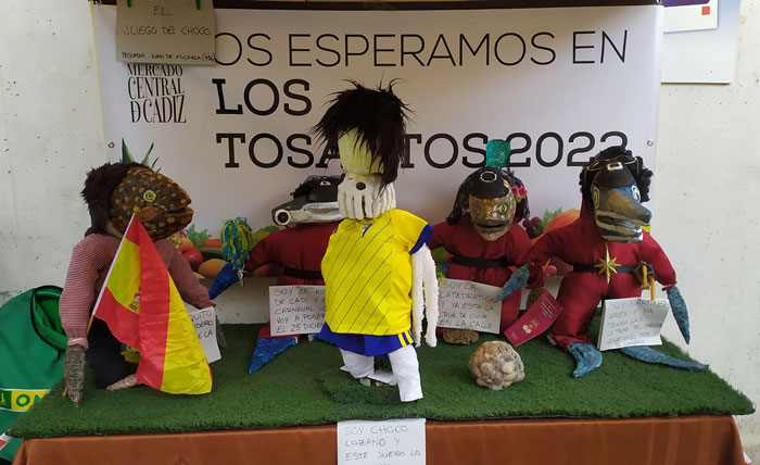 Este año ni el gaditano Mercado Central ni el Virgen del Rosario han celebrado la fiesta de ToSantos. Aunque en los mercados apenas se notan ya las restricciones, Asodemer decidía no llevarla a cabo por temor a poner en riesgo la salud de los ciudadanos. Sin embargo esta decisión no ha impedido que algunos de los comerciantes que pueblan el mercado del casco antiguo hayan querido hacer un guiño a una fiesta que cuenta con muchísimos seguidores. Por eso hemos visto en estos días unas pequeñas carpas con unos Tosantos en miniatura que han querido parodiar la actualidad de nuestra ciudad y parte del país.