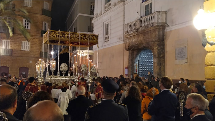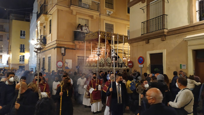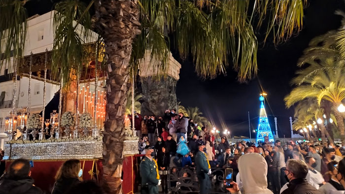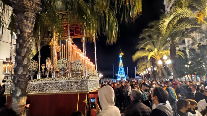 Tal y como estaba anunciado, a las 18.00 horas salía de la Catedral Vieja la Virgen de la Salud dispuesta a celebrar el 75 aniversario fundacional de su hermandad. Lo hacía con una procesión extraordinaria que se prolongaba hasta las diez de la noche. En la calle mucha gente, deseosa de ver cofradías. Al menos eso se intuye. Pese a que el Ayuntamiento ha intentado que los exornos navideños no interfirieran en la procesión, la imagen en San Juan de Dios con el árbol gigante de fondo nos ha regalado una estampa inédita que a los más curiosos seguro les ha gustado.