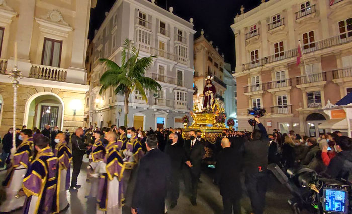 Jesús de la Sentencia ha presidido hoy el Vía Crucis oficial de la Semana Santa gaditana con la que prácticamente se inaugura la Cuaresma en Cádiz. Con restos de papelillos de los carnavales recién terminados aún en el suelo, Jesús de la Sentencia entraba en San Juan de Dios pasadas las nueve y cuarto de la noche tras salir de la Catedral a las 20.40 horas. El olor a incienso cambia radicalmente el ambiente que hace solo unas horas tenía la popular plaza gaditana. Jesús se encamina hacia la Merced donde se recoge ante la presencia de sus muchos vecinos que no lo veían en una parecida desde que en 2019 tuviese que recogerse a escasos minutos de su salida por la lluvia. Tras el acto de hoy, Jesús de la Sentencia volverá a salir a la calle el Miércoles Santo si las condiciones meteorológicas dejan para alegría de sus muchos fieles y hermanos.