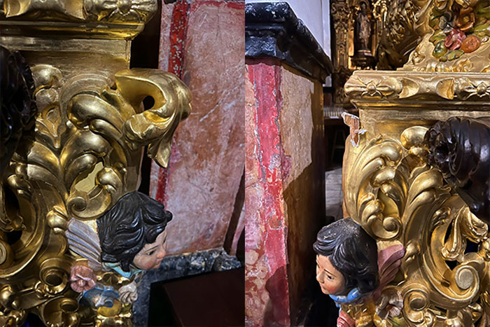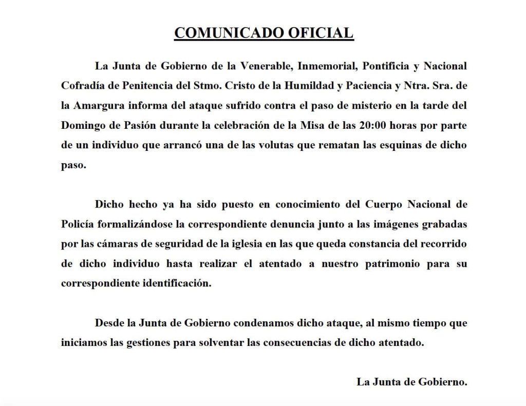 Sin embargo el buen ambiente reinante en la ciudad se saldaba con un suceso que en cierta forma empañaba el fin de semana y sobre todo el Domingo de Pasión: sucedía durante la misa que se celebraba a las 20 horas en la iglesia de San Agustin. Un individuo accedía a la misma arrancando una de las volutas que rematan las esquinas del paso del Cristo. Rápidamente la Cofradía emitía un comunicado oficial, donde informaba que el ataque había quedado grabado por las cámaras de seguridad de la iglesia. Esperemos que den pronto con él.