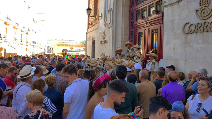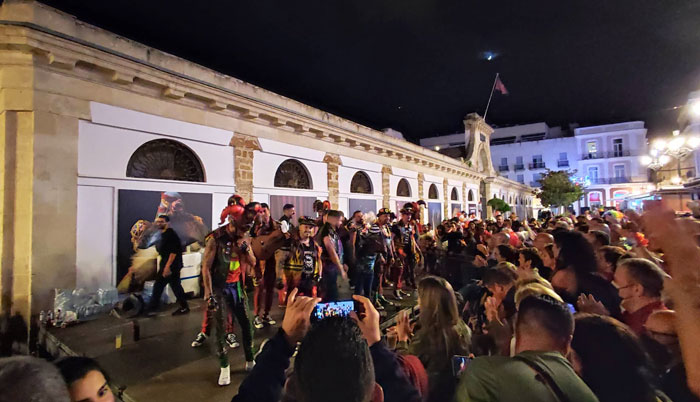 De primeras el sábado después de la Final del Falla por la mañana pasaba por una mañana cualquiera. Sin nada que nos hiciera percatarnos de que estábamos ante el primer sábado de carnaval. Sin embargo a medida que las horas iban avanzando, los primeros disfraces comenzaban a pasearse por las calles gaditanas. Más fresquitos que otros años, tal y como muchos pronosticábamos. Aunque el de osito con pelitos por ejemplo no faltó a una jornada, todo hay que decirlo, donde no hacía especial calor gracias al viento de poniente que no quiso perderse el pistoletazo de salida del carnaval en la calle. El caso es que a media tarde en Cádiz ya se percibía el ambiente a carnaval. Desde las 19.00 horas los tablaos ubicados en la plaza del Palillero, Desamparados, la esquina de la cafetería la Marina o los alrededores del mercado comenzaban a ser ocupados por agrupaciones finalistas y semifinalistas atrayendo así a muchísimo público. La calle Ancha y sobre todo San Antonio se llenaban hasta los topes para presenciar el Pregón de India Martínez a pesar de los problemas de sonido que hacía que solo se escuchase a la pregonera y no a la mayorías de los invitados al acto. La noche nos dejaba ya un Cádiz que vivía su sábado de carnaval repartido en los numerosos tablaos instalados en diferentes plazas. Aunque no con la masa de gente que suele venir en febrero, todo hay que decirlo.