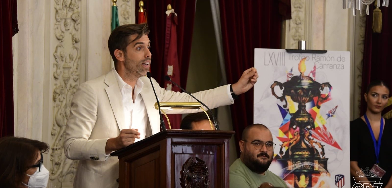 El periodista gaditano José Yélamo ha presentado esta mañana en el Ayuntamiento de Cádiz, la LXVIII edición del Trofeo Carranza, que enfrentará esta noche al Cádiz CF con el Atlético de Madrid en el estadio Nuevo Mirandilla. Un acto al que han asistido el alcalde de Cádiz, José María González, el vicepresidente del Atlético de Madrid, Antonio Alonso; el presidente del Cádiz CF, Manuel Vizcaíno; el vicepresidente, Rafael Contreras; el adjunto a la presidencia, Pepe Mata; y el consejero del club, Jorge Cobo.