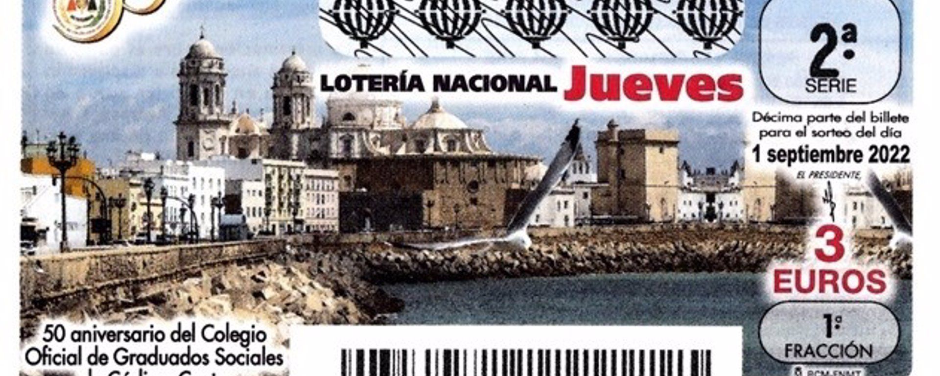 Este jueves 1 de septiembre la Lotería Nacional celebrará su sorteo semanal con un décimo muy especial que tendrá a Cadiz como imagen de fondo. El motivo es el 50 aniversario del Colegio Oficial de Graduados Sociales de Cádiz y Ceuta. Motivo por el cual en el décimo podemos ver además el logotipo de las bodas de oro del Colegio junto a la frase: “Operadores jurídicos al servicio de los intereses de empresas y trabajadores”. Como es costumbre en su edición del jueves, por sólo tres euros los participantes podrán optar a un primer premio de 30.000 euros (300.000 euros a la serie) o un segundo de 6.000 euros (60.000 euros a la serie). Solo por el recuerdo merece la pena comprarlo. Suerte a todos por si acaso!