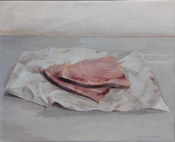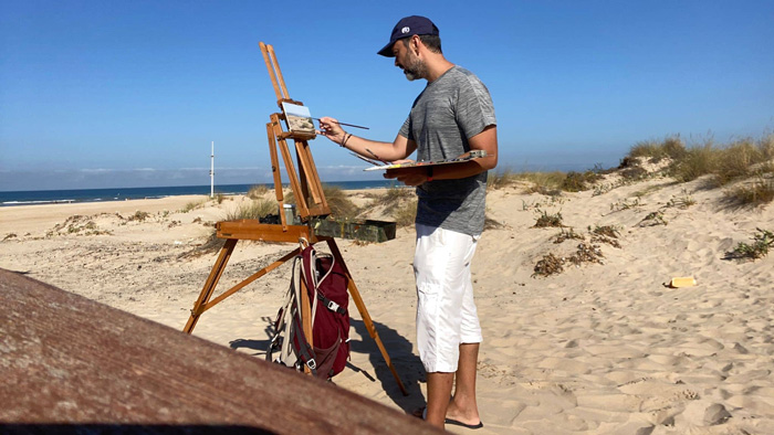 ¿Qué nos vamos a encontrar en la exposición? Durante todo el mes de agosto Fernando se ha ido a la playa de Cortadura a pintar pequeñas tablillas de unos 20 centímetros que serán allí expuestas. Al igual que una impresionante vista de la plaza de San Antonio vista desde El Casino Gaditano en un cuadro de un 1.30 cm. de dimensión. La exposición se completa con figuras, paisajes y bodegones en óleo sobre lienzo reforzadas algunas con tablas y la obra llamada «Al final del pasillo II», una pintura de interior pintada al natural que recibió este mismo mes Mención de Honor en el «LVI Certamen Andaluz de pintura Villa de Ubrique».