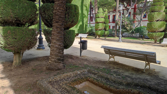 Porque al lamentable estado del suelo y los bancos se unen la rotura de bastantes barrotes de las rejas que lo rodean, fuentes sucias y secas como una mojama y el deplorable estado de muchos de sus jardines. Muertos, sin césped y sin plantas, por no tener, han perdido hasta el bordillo. Señal de que la falta de mantenimiento es más que evidente. Miro hacia la cascada, la parte de los juegos infantiles o la de la fuente de «Los niños del Paraguas» y son las más decentes aunque desde luego bastante mejorables. De hecho me fijo en que al templete ya se le asoman varios ladrillos en la base al caérsele el mármol de la parte de abajo. ¡Quién sabe cómo estará cuando se decidan a meterles mano! ¡Qué lástima un parque tan bonito como el Genovés y dejado completamente de la mano! ¡Qué poco partido saben sacarte, Cádiz!
