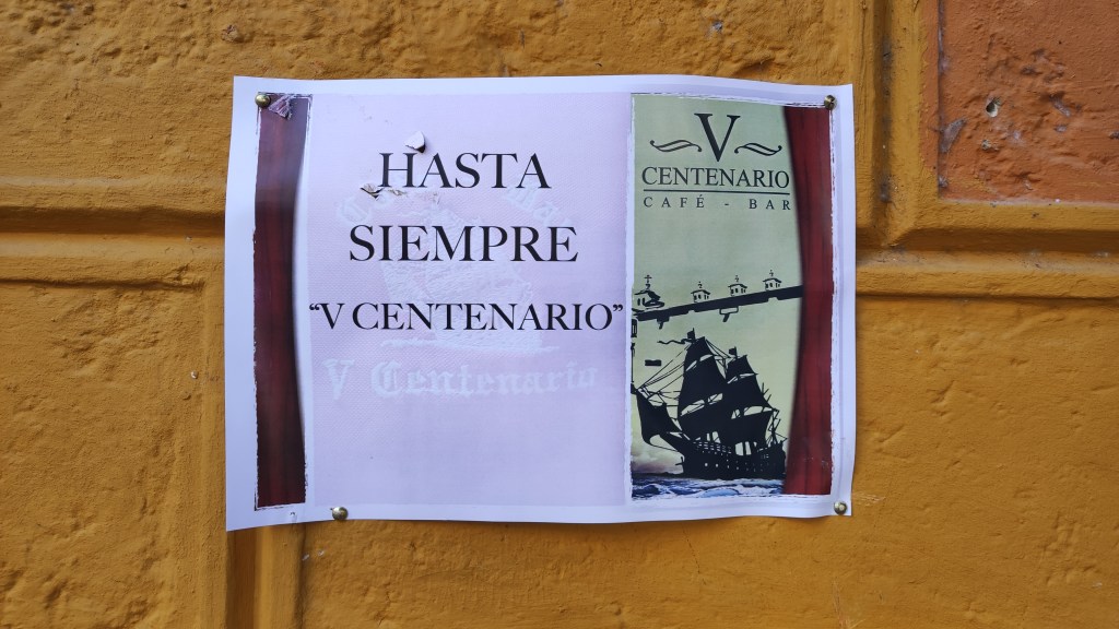 @ManoloDevesa. El café bar V CENTENARIO, ubicado en la céntrica plaza de San Francisco ha cerrado sus puertas despidiéndose mediante un emotivo cartel de su clientela con un «Hasta siempre» tras más de veinte años abierto al público. Lo ha hecho después de que la «Marisquería San Francisco», ubicada justamente al lado, se haya hecho cargo de ella. Parece que en su nueva etapa, el bar pasará a formar parte de la marisquería como un freidor ofreciendo el tan solicitado pescaíto frito.