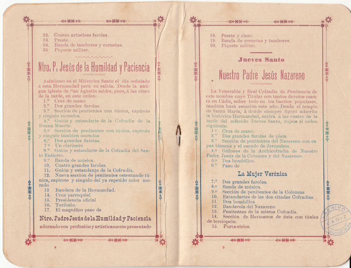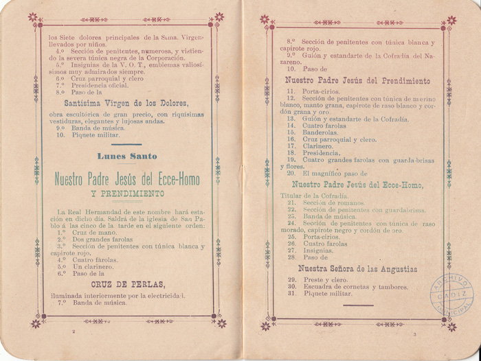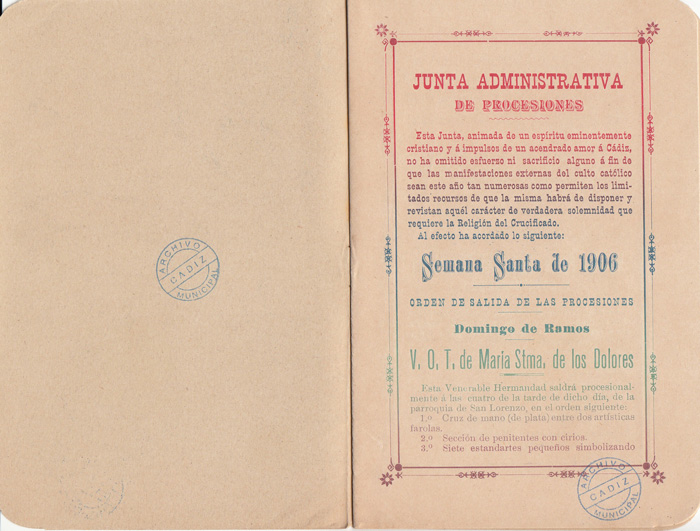 El amigo Teo Cardoso nos deleita muy a menudo gracias a su cargo en el Archivo Municipal de Cádiz con auténticos tesoros y curiosidades. Esta semana lo hacía – muy acorde a la fecha en la que estamos – sobre la Semana Santa de 1906 aportando para colmo una especie de itinerario donde podemos observar muchas cosas dignas de comentar. Para empezar eso de que el Domingo de Ramos se inauguraba con la Borriquita no siempre fue así. La Santísima Virgen de los Dolores, de la que se presume era de «gran precio y con riquísimas vestiduras» era la única en procesionar el primer día de la Semana Santa. El Lunes, que no el Martes, el Ecce Homo salía de la iglesia de San Pablo a las cinco de la tarde junto a la Virgen de las Angustias y el Prendimiento. De San Lorenzo salía el Martes Santo en torno a las cuatro de la tarde Afligidos y la Piedad salida de Santiago. Las puertas de San Francisco se abrirían un miércoles para que Vera-Cruz hiciese su salida procesional a las cinco de la tarde junto a Humildad y Paciencia que a las cinco de la tarde saldría de San Agustín.