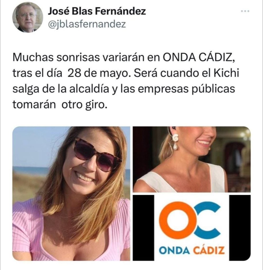Sin quererlo ni mucho menos Mirian Peralta se ha convertido en la protagonista de la semana tras los lamentables twitts que José Blas Fernández, ex concejal popular que fue durante la época de Teófila Martínez ha hecho esta misma semana. «Muchas sonrisas variarán en ONDA CÁDIZ tras el día 28 de mayo. Será cuando el Kichi salga de la alcaldía y las empresas públicas tomarán otro giro» decía junto a dos imágenes de la periodista y el logotipo antiguo de Onda Cádiz provocando un aluvión de reacciones. ¿Qué le pasa a Pepe Blas? Pues nada nuevo. El que fuese teniente alcalde del Gobierno de Teófila no es la primera vez que muestra su poco estilo en las redes. De hecho su cuenta está llena de alusiones al actual alcalde y equipo de gobierno en unas formas que dejan bastante que desear.