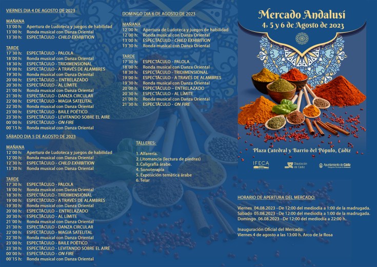 El Mercado Andalusí, organizado por el Ayuntamiento de Cádiz y la Diputación provincial de Cádiz, a través de IFECA volverá a Cádiz este fin de semana tal y como vienen haciendo desde hace veinticuatro años. Así, durante todo este fin de semana se concentrarán en Cádiz una gran variedad de sectores y oficios como marroquinería, trabajos en vidrio, juguetes, cerámica, ornamentación, plantas etc…