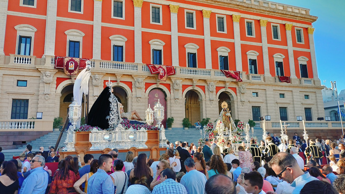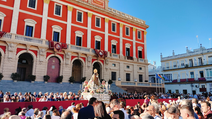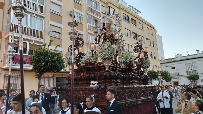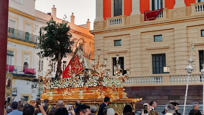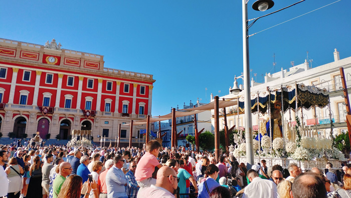 La bonita y céntrica Plaza del Rey se convertía en el inicio de la carrera oficial. Los toldos echaban el cable al numeroso público que buscaba la sombra de una jornada que ha superado los 30 grados. Y allí mismo se colocaba la Virgen del Carmen, patrona de San Fernando, para presidir el paso del resto de hermandades. A partir de ahí, los isleños han podido disfrutar por este orden del magnífico cortejo: Simpecado de la Hermandad del Rocío, María Santísima de las Angustias, María Santísima de la Victoria, Nuestra Señora de las Mercedes, María Santísima de los Desamparados, María Santísima de las Penas, Nuestra Señora del Rosario en Sus Misterios Dolorosos, María Santísima del Buen Fin, María Santísima del Amor, María Santísima de la Estrella, María Santísima de la Piedad, María Santísima de la Salud, Nuestra Señora de la Caridad, Nuestra Señora María Santísima de las Lágrimas, María Santísima de la Esperanza, María Santísima del Mayor Dolor en Su Soledad, Nuestra Señora del Mayor Dolor, María Santísima de los Dolores. Hermandad del Nazareno, Nuestra Señora de la Soledad, Inmaculada Concepción, María Santísima de la Trinidad, María Santísima de los Dolores -Servitas, María Santísima de Gracia y Esperanza Coronada, Divina Pastora de las Almas Coronada y Nuestra Señora del Carmen Coronada.