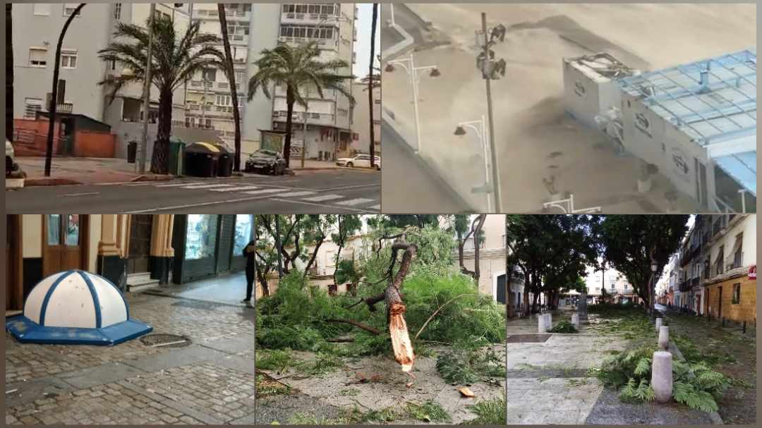 La borrasca Bernard se ha dejado sentir a lo largo del día de hoy en toda la península y en Cádiz capital ha arrasado con árboles por las rachas de viento que han llegado a ser de hasta 100 km/h. A lo largo de toda la tardes las redes sociales se han llenado de vídeos y fotografías que recogen los daños ocasionados principalmente por el viento a pesar de que también el agua se ha dejado caer de manera intensa. Así hemos podido ver la playa perdiendo muchísima arena, la plaza del Mentidero como si fuese un bosque por la cantidad de verde que había en el suelo producto de la caída de ramas y árboles y palmeras cayéndose en plena avenida.