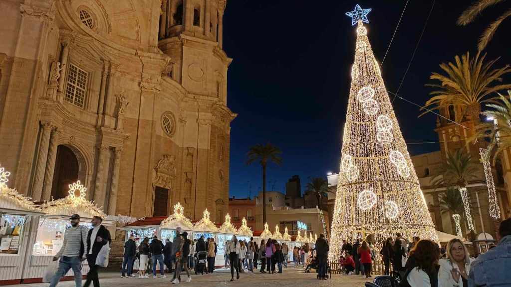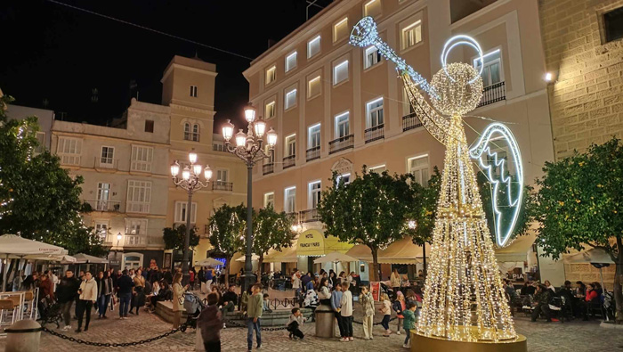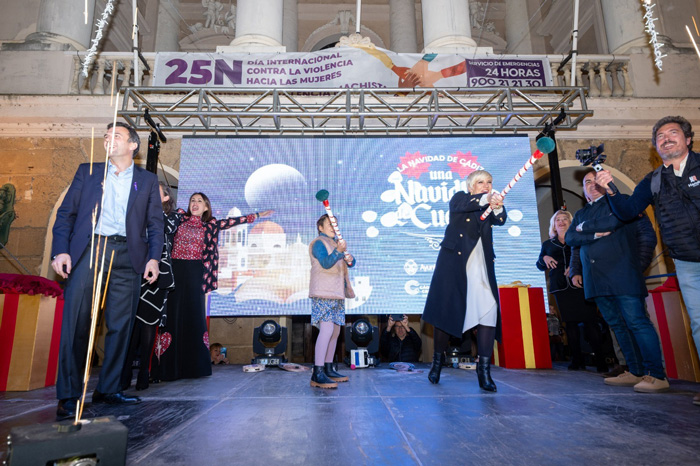 Bajo el lema ‘Una Navidad de Cuento’, Cádiz ha dado por inaugurada su Navidad con la Fiesta del Alumbrado que arrancaba a las 18:30 horas con la celebración de los conciertos de los grupos infantiles ‘Los JU’, ‘Zascanduri’ y ‘Volver a EGB’. A las 19:30 horas la cantante Pasión Vega procedía al encendido del alumbrado extraordinario acompañada por el alcalde de la ciudad, Bruno García, la concejala de Fiestas, Beatriz Gandullo y los representantes de las asociaciones de comerciantes, tanto del casco histórico como de extramuros. Tras este simbólico acto, la Plaza de San Juan de Dios se convertía en el escenario de una gran nevada artificial.