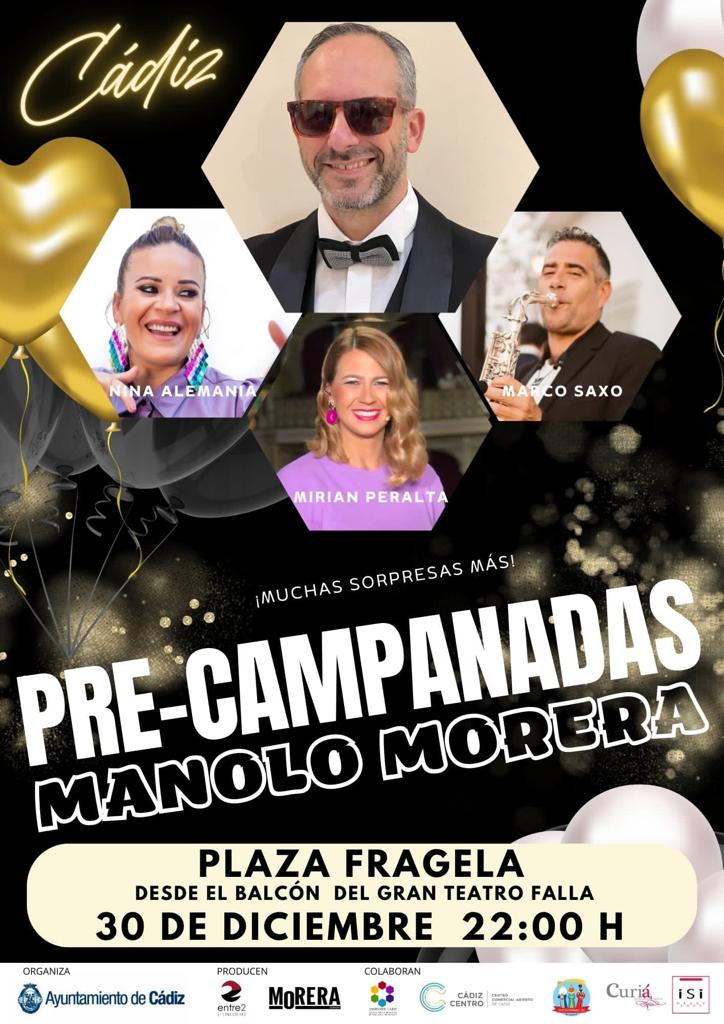 Onda Cádiz retransmitirá esta noche las precampanadas que el humorista Manolo Morera llevará a cabo desde el balcón del Gran Teatro Falla. El espectáculo dará comienzo a las 22 horas y aunque este año lo hará sin su pareja artística por antonomasia que es Juan Carlos Meni, habrá distintos colaboradores que amenizarán las uvas más cachondas de España. La periodista Miriam Peralta, con la que realizará un repaso de las noticias más relevantes de este año 2023, Marcos Saxo o Nina Alemania, entre otros.