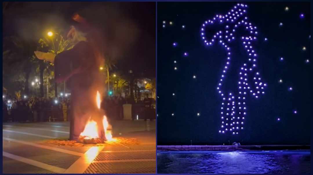 Ya sobre las 22.00 horas en la Plaza de Fernando Quiñones tenía lugar el acto de la Quema de la Bruja Piti y un espectáculo de luces y sonido que dejaban una imagen que se ha repetido bastante en las redes sociales: la del inolvidable Juan Carlos Aragón a través de los numerosos drones que han poblado el bonito cielo gaditano.