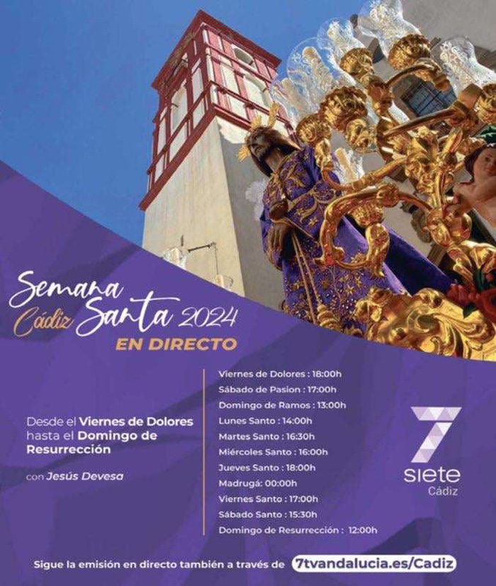 Por otra parte y cada vez con más aceptación, la emisora 7 TV Bahía hará lo propio desde la plaza de San Agustín el paso de las diferentes hermandades en una retransmisión que llevarán a cabo Jesús Devesa, Juan Carlos Carmona, Ana Mendoza y José Manuel Romo con una importante novedad: la retransmisión de toda la madrugada. A pesar del parón de dos horas en la Carrera Oficial, el programa capitaneado por Devesa estará en esas horas cubriendo en el lugar donde se encuentren el Nazareno, El Perdón o Medinaceli.