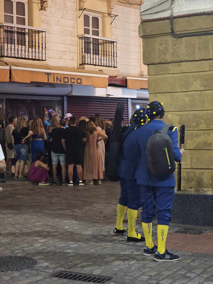 Calles abarrotadas en la noche de ayer en el transcurso del carnaval de verano. Las diferentes agrupaciones ilegales que salían dispuestos a captar la atención de los muchos gaditanos y visitantes, lograban su objetivo. De hecho el barrio del Pópulo se encontraba a reventar. Hubo un momento en que en la plaza de Fray Felix no cabía un alfiler. Un numeroso público reía y cantaba al son de las agrupaciones que se arremolinaban por allí. Entre otras la chirigota de Casapuerta, ‘Clínica privada del Doctor Potato’, o la del dúo de José Flor y Pedro Ruiz Thomas, ‘Abatar, desavío en el espacio’.