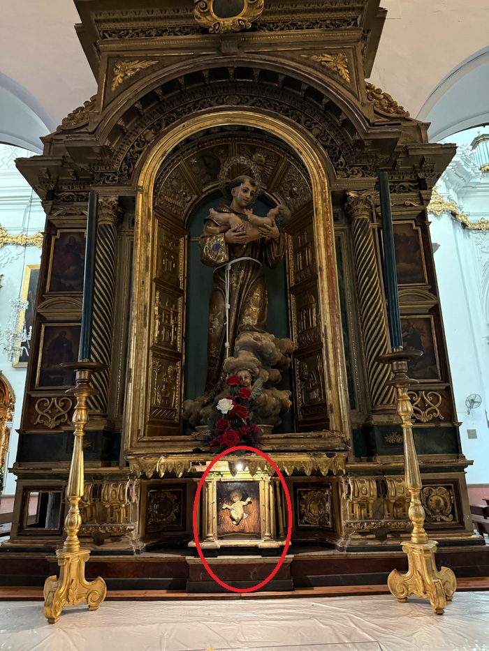 La pista número 2 era más una aclaración que otra cosa: «Nuestro niño Jesús no pertenece a ningún nacimiento. La figura se lleva en el lugar todo el año…» Así es porque el Niño Jesús de la fotografía se lleva en el mismo sitio todo el año. Hay que entrar por la puerta de la plaza Santísimo Cristo de la Veracruz para encontrártelo prácticamente de cara.