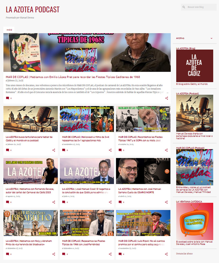 Los podcasts de LA AZOTEA están de vuelta. El primero en volver es el dedicado a nuestra fiesta grande: el carnaval. MAR DE COPLAS vuelve este mismo domingo para recordar las Fiestas Típicas de 1968 presentado por Manuel Devesa y Manuel Trinidad que, en esta ocasión recibirán al mítico Emilio López Prat, comparsista del no menos mítico Paco Alba. En sucesivas semanas se irán recuperando otros podcasts como LA AZOTEA con sus entrevistas a personajes populares tanto a nivel local como nacional o LA TERTULIA DE LA AZOTEA que se pretende lanzar como gran novedad.