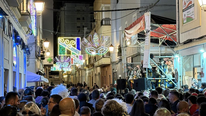 Con el segundo fin de semana ya encima y con los pronósticos que preven mucha lluvia, gaditanos y visitantes se echaron a la calle en la tarde noche del jueves para aprovechar por aquello de que pueda ser el último día de carnaval sin sobresaltos. Por eso cada plaza que uno pisaba estaba llena a reventar. Sucedió en una plaza de San Francisco a reventar donde El Yuyu cantaba su repertorio antes de que «Los del otro barrio» lo hicieran también. Pero además se celebraba «La Aguja de oro» que se la llevaba la comparsa «Las ratas» sin un Jesús Bienvenido que se encontraba en la plaza de San Antonio con su espectáculo «Las 4 suits de Momo» junto a la banda «Agapornis«. Una experiencia única donde Jesús supo ir ganándose al público y llenando la plaza de San Antonio a través de diferentes cuartetas de popurrís y presentaciones de cuatro de sus comparsas: «Los irracionales», «Los currelantes», «Los del piso de abajo» y «Los Santos» hechas canciones llevadas al soul y funk de los excelentes «Agapornis». El pregonero Antoñito Molina estuvo con él para cantar un trocito de «Los del piso de abajo». Sin duda un verdadero acierto el show.