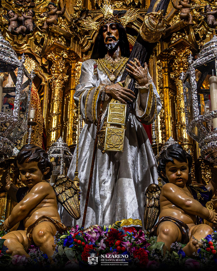 El exorno floral ha sido elaborado por el florista Alejandro Montes de Oca, quien ha diseñado un monte de flores colorido con diferentes variedades, concebido para acompañar con viveza y solemnidad el paso del Regidor Perpetuo por los barrios de Extramuros. El monte está compuesto por helecho de cuero, alstroemeria moradas, rosas rojas, rosas vendela, rosas stars platinum violeta, clavel rojo, crisantemo sangre, hipericum rojo, statice morado, limonium rosa, cardos morados y eucalipto, creando una combinación cromática que envuelve la parihuela con tonos intensos y matices simbólicos que refuerzan el carácter extraordinario de esta salida.Sobre la parihuela se han dispuesto los cuatro angelotes tallados por Juan Luis Vasallo Parodi en la década de 1940, junto a los faroles de orfebrería pertenecientes al paso de misterio de Nuestro Padre Jesús Nazareno. Estas piezas son obra de los talleres sevillanos de Seco Velasco y datan de mediados del siglo XX.