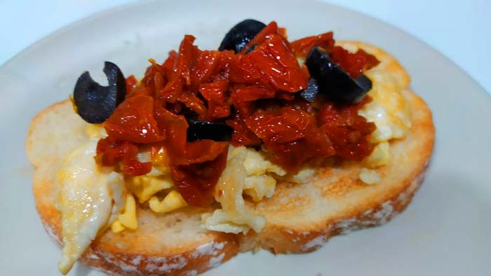 Tosta de huevos revueltos con tomates secos y aceitunas